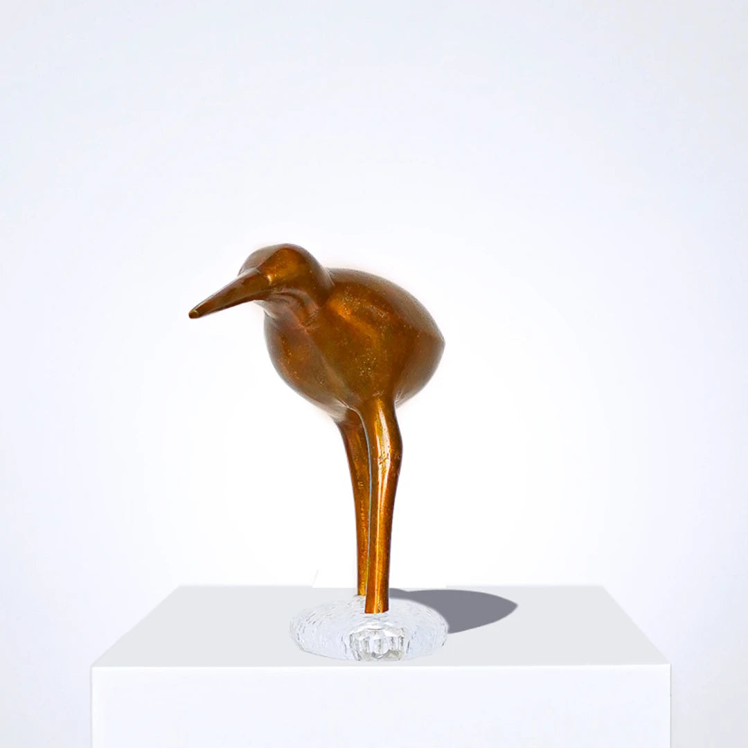 Golden Herald stands poised in quiet anticipation — a long-beaked bronze bird balanced delicately on a clear glass base. Its sleek silhouette and forward-leaning stance capture the moment just before flight, symbolizing readiness, opportunity, and the promise of renewal. The contrast between warm bronze and cool transparent acrylic creates a visual harmony, reflecting the balance between ambition and serenity. A sculpture of auspicious beginnings, Golden Herald brings depth, optimism, and sculptural sophistication to any space.