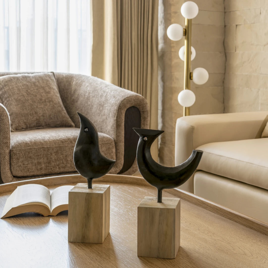 The Shadow Perch Set is a sophisticated duo crafted to bring depth, balance, and sculptural elegance into your space. Designed with smooth contours and a confident silhouette, each piece sits with the quiet assurance of a watchful guardian, grounded yet expressive, minimal yet powerful. The shadow-toned finish adds a sense of mystery and refinement, making the set a striking addition to consoles, shelves, entryways, or curated décor arrangements. Together, they create a composed visual rhythm that enhances both modern and transitional interiors.