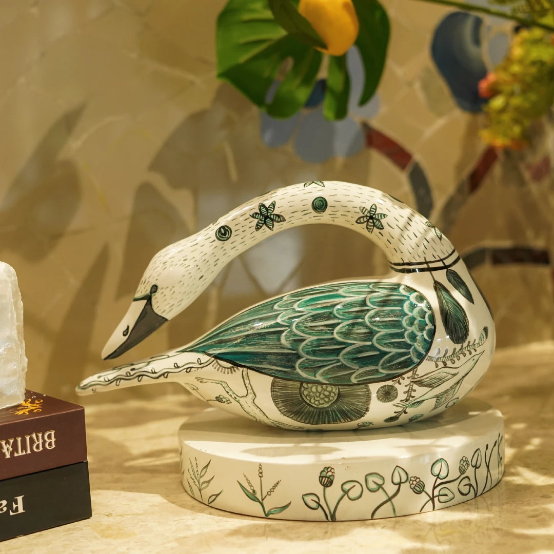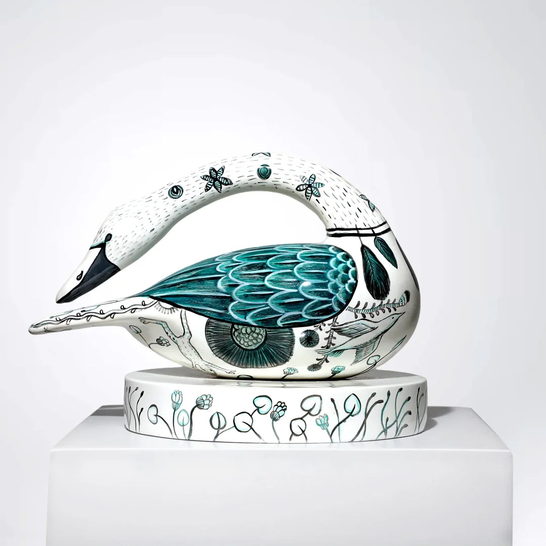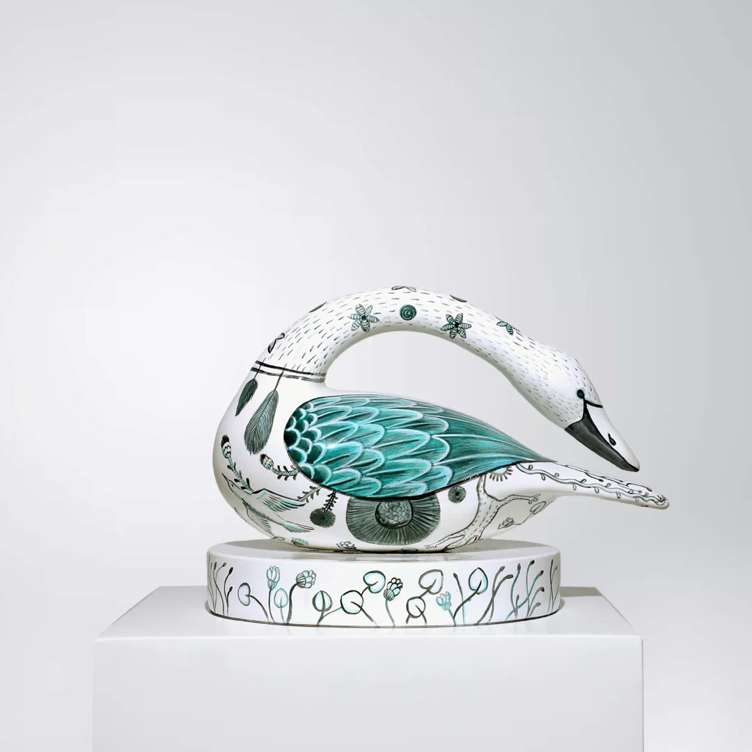 A tribute to serenity and craftsmanship, Curlew embodies the tranquil beauty of a swan, its form curved in perfect harmony, adorned with hand-painted botanical motifs that celebrate the rhythm of nature. The intricate patterns and cool teal tones lend it an air of refined sophistication, while its gentle posture exudes calm and balance. Every brushstroke tells a story of peaceful coexistence between art and emotion, between stillness and flow. Whether placed on a console, sideboard, or centerpiece table, Curlew transforms your space into a sanctuary of elegance and mindfulness.